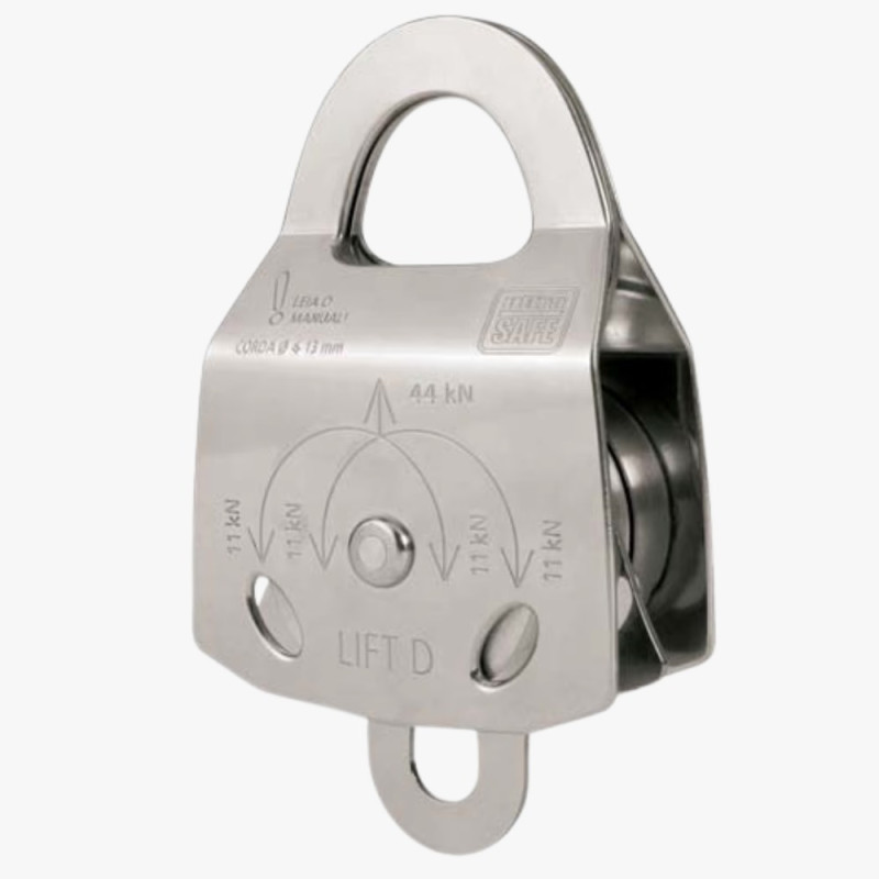 Polia para uso em corda, produzida em placas oscilantes de aço inox, possui formato ideal para instalação de nó auto blocante. Este recurso é recomendado em sistemas de redução durante resgates, içamentos de cargas e espaço confinado.