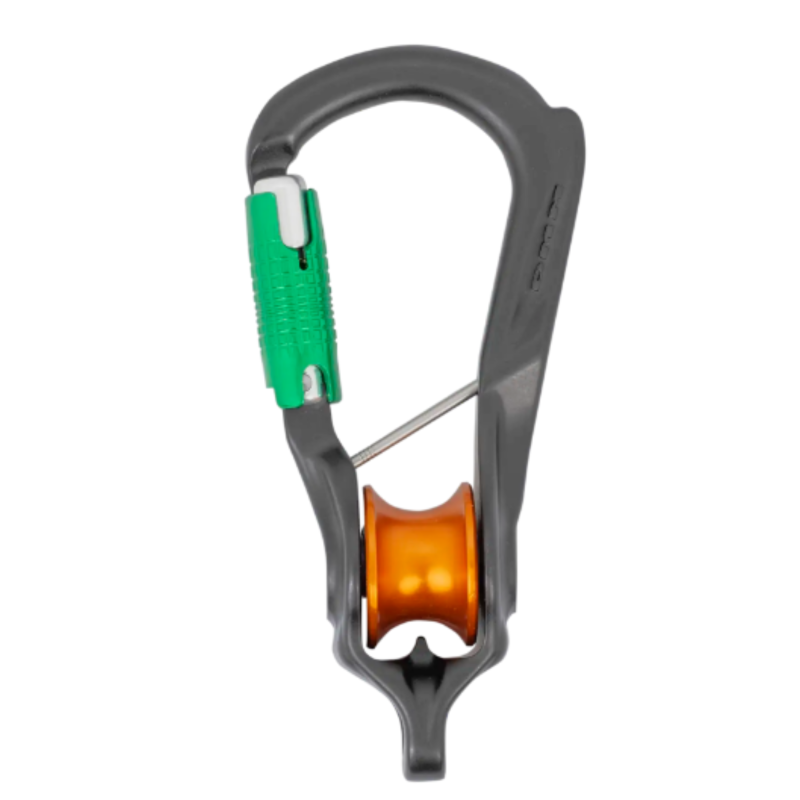 Um conector com polia integrada. Possui polia(s) de rolamento de alta eficiência, barra cativa removível com rosca e um engate resistente e resistente a tecidos.