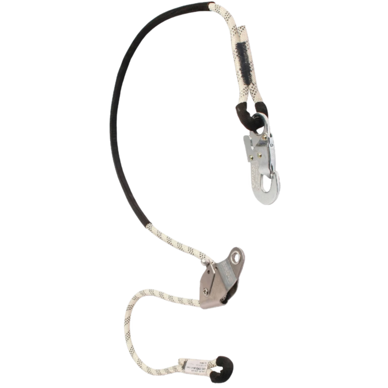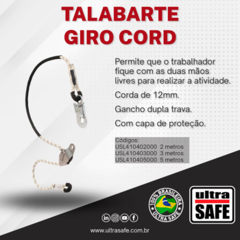 Dispositivo bloqueador Giro Cord: Confeccionado em aço inox, came em liga de alumínio e alavanca em polímero para regulagem do comprimento da corda do talabarte.
